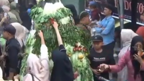 Berbagai Gunungan dari hasil perkebunan seperti Tomat, Cabai, Kol dan Sayur mayur lainnya di arak ratusan masyarakat Setiap Rukun Tetangga (RT) menuju lokasi acara di lapangan desa.