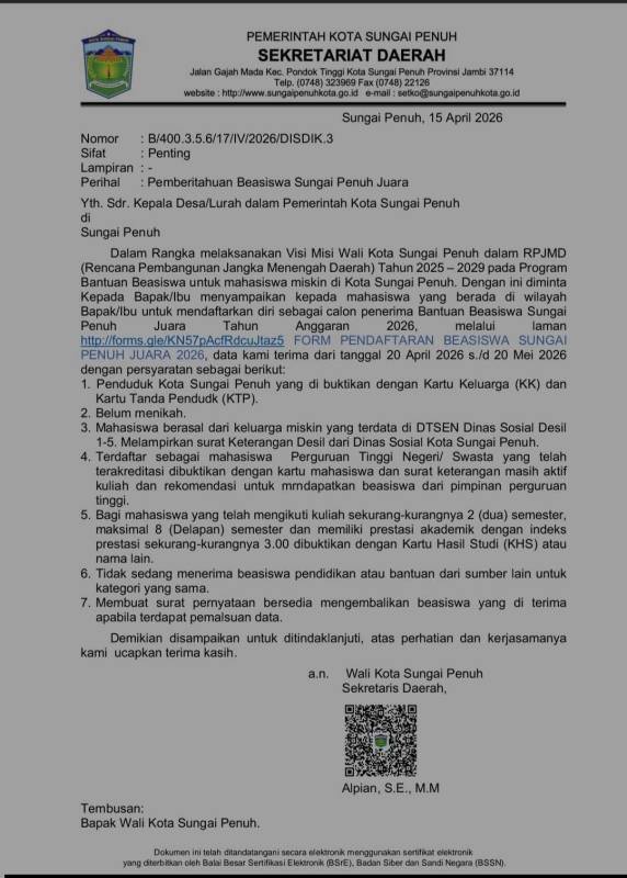 SUNGAIPENUH, SIGNALBERITA.COM – Kabar Gembira bagi Mahasiswa di kota Sungai Penuh, karena Pemerintah Kota Sungai Penuh kembali membuka program unggulan di sektor pendidikan melalui Beasiswa Sungai Penuh Juara 2026. Program ini di tujukan bagi mahasiswa dari keluarga kurang mampu agar tetap dapat melanjutkan pendidikan tinggi.