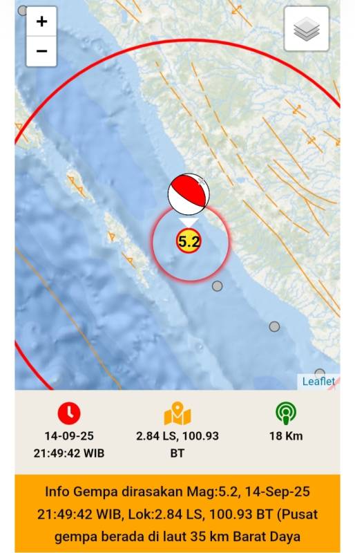 SIGNALBERITA.COM – Gempa berkekuatan 5,2 magnitudo kembali mengguncang kabupaten Mukomuko Bengkulu, pada Minggu malam (14/9/2025).
