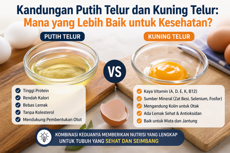 Putih telur dan kuning telur sama-sama memiliki manfaat penting. Putih telur unggul dalam protein rendah kalori, sementara kuning telur kaya vitamin, mineral, dan antioksidan. Mengonsumsi telur secara utuh dengan porsi yang seimbang dapat membantu memenuhi kebutuhan nutrisi harian tubuh.***