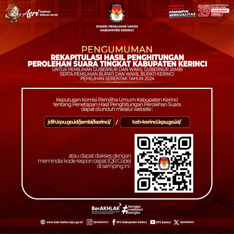 Berikut Link Pengumuman Hasil Rekapitulasi perolehan suara tingkat kabupaten Kerinci: