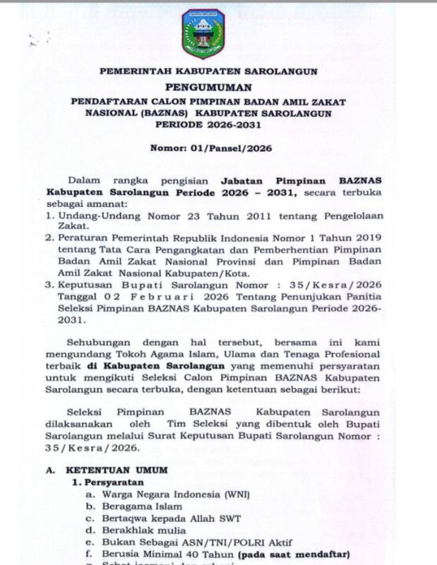 SAROLANGUN, SIGNALBERITA.COM – Pemerintah Kabupaten Sarolangun resmi membuka pendaftaran Calon Pimpinan Badan Amil Zakat Nasional (BAZNAS) Kabupaten Sarolangun untuk periode 2026–2031. Pengumuman tersebut tertuang dalam Nomor: 01/Pansel/2026.