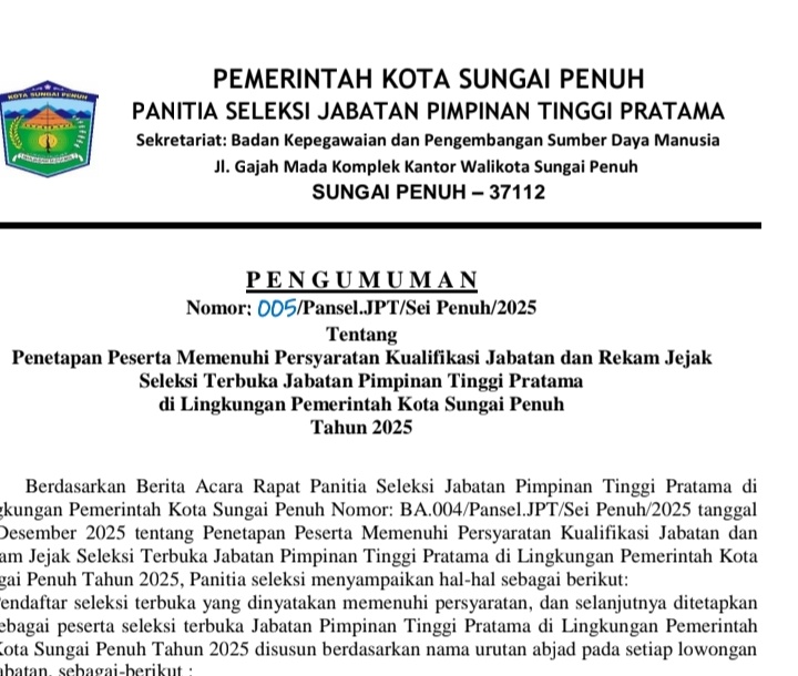 Sebelumnya, Pemerintah Kota Sungai Penuh membuka seleksi terbuka untuk mengisi tujuh jabatan strategis guna memperkuat kinerja birokrasi dan pelayanan publik.