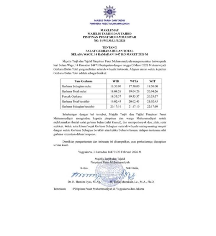 YOGYAKARTA, SIGNALBERITA.COM — Muhammadiyah melalui Majelis Tarjih dan Tajdid Pimpinan Pusat Muhammadiyah mengimbau umat Islam melaksanakan salat gerhana pada Selasa…