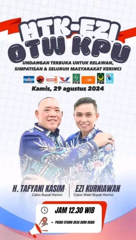 KERINCI, SB - Pasangan Bakal Calon Bupati/wakil Bupati Kerinci H Tafyani Kasim-Ezi Kurniawan, dipastikan akan mendaftar ke Komisi Pemilihan Umum…