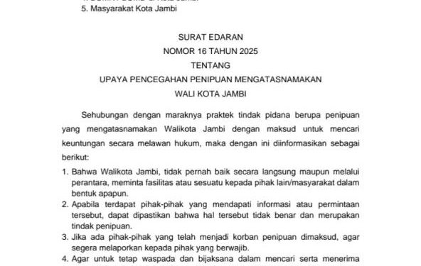 Peringatan ini disampaikan melalui Surat Edaran Wali Kota Jambi Nomor 16 Tahun 2025 tentang Upaya Pencegahan Penipuan Mengatasnamakan Wali Kota Jambi.